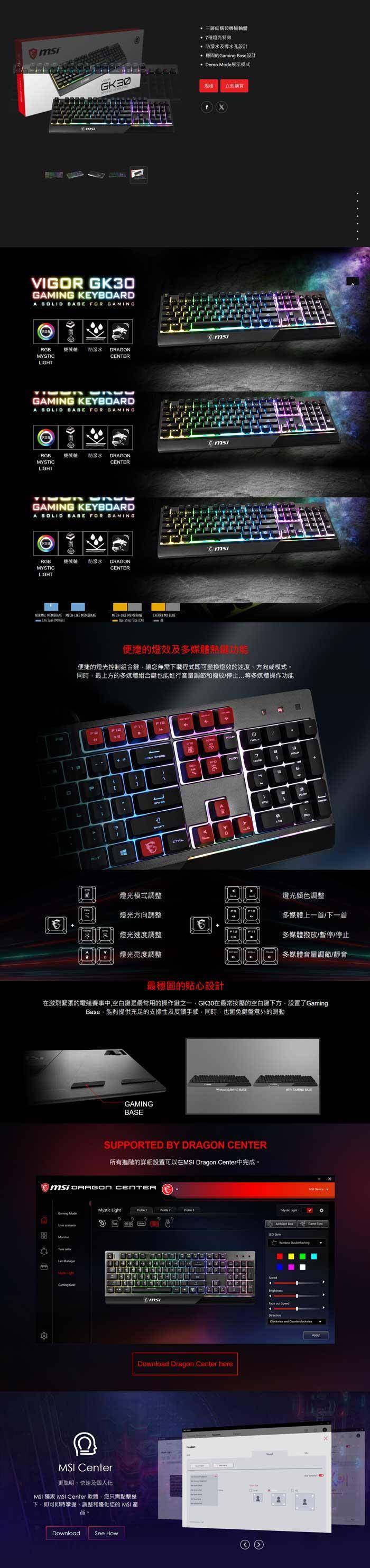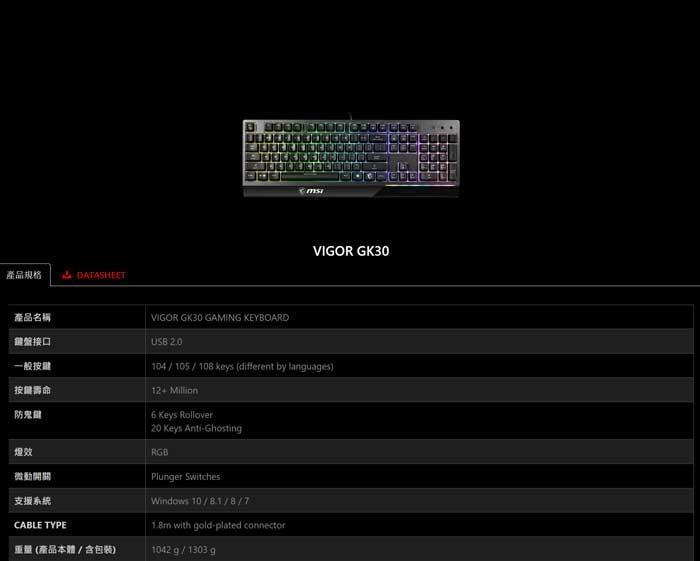 【MSI 微星】Vigor GK30 TC 電競鍵盤(黑色/有線/薄膜式/RGB/中文/1年保固)