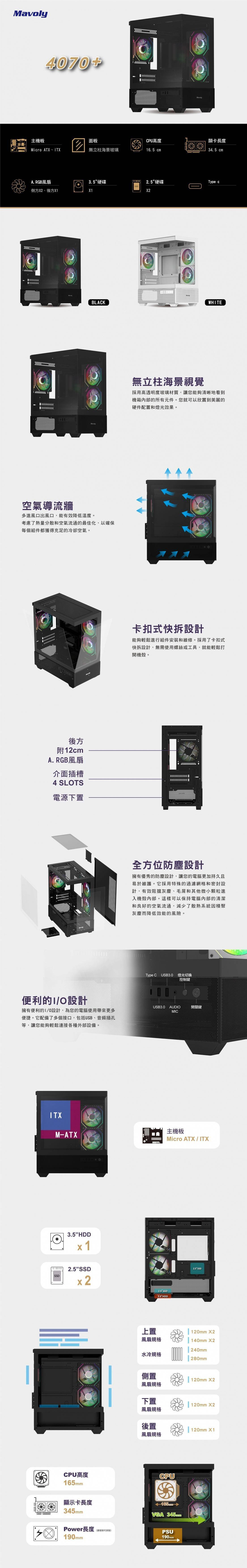 【Mavoly 松聖】4070+ 全景玻璃機殼 (M-ATX/內建風扇側2後1/顯卡345mm/塔散165mm),工作狂購物網