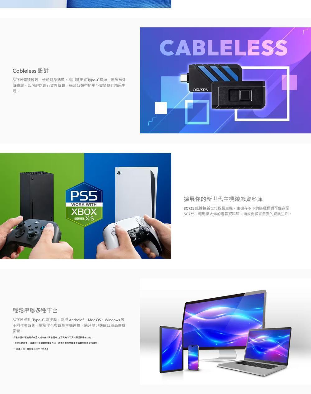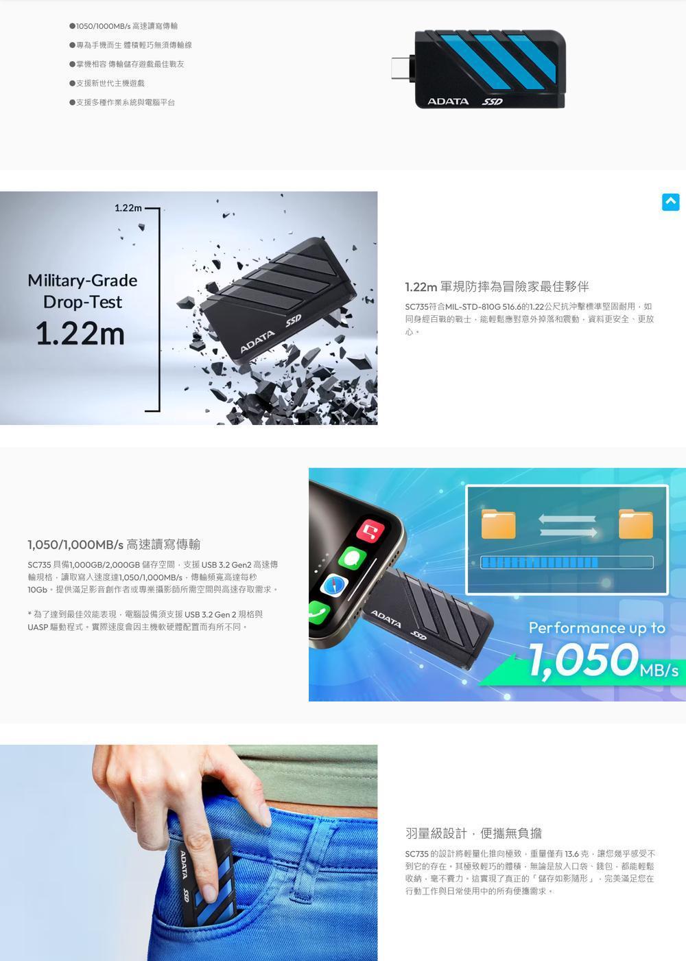 【ADATA 威剛】SC735 外接式固態硬碟 1TB SSD (黑藍/黑灰//USB3.2/Gen2/5年保),工作狂購物網
