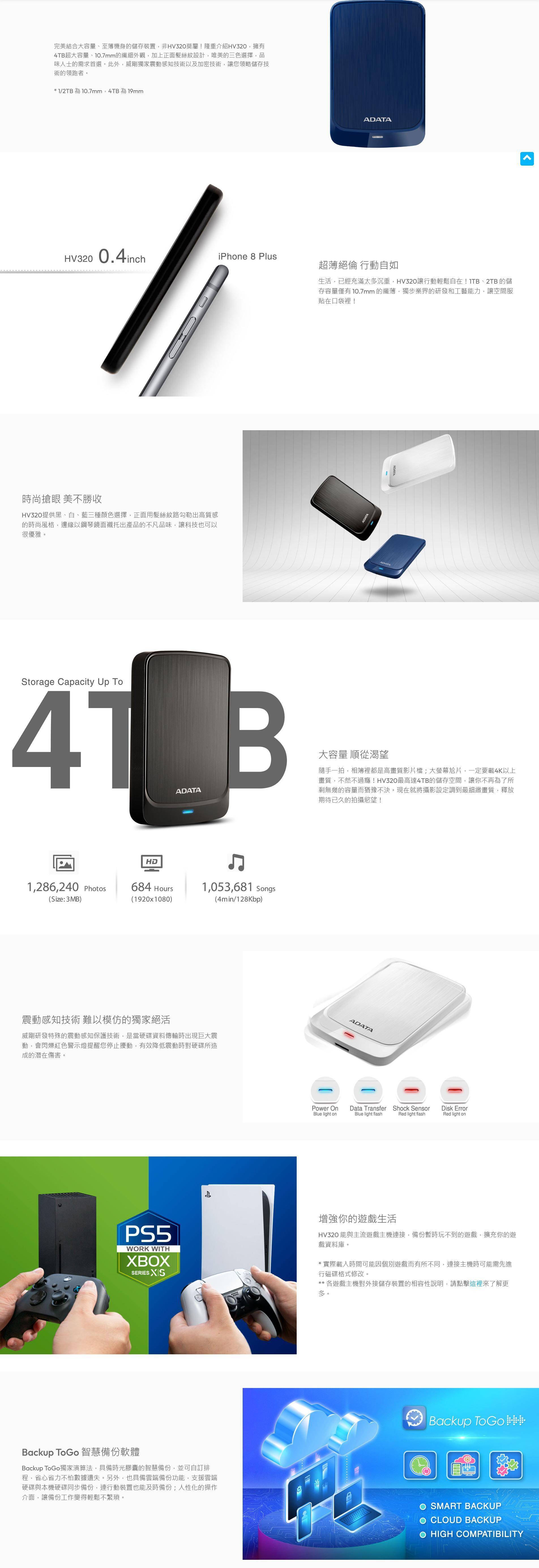 【ADATA 威剛】HV320 2.5吋行動硬碟 1TB HDD (黑/白/藍/USB3.2/LED操作指示燈號/薄型碟/3年保),工作狂購物網