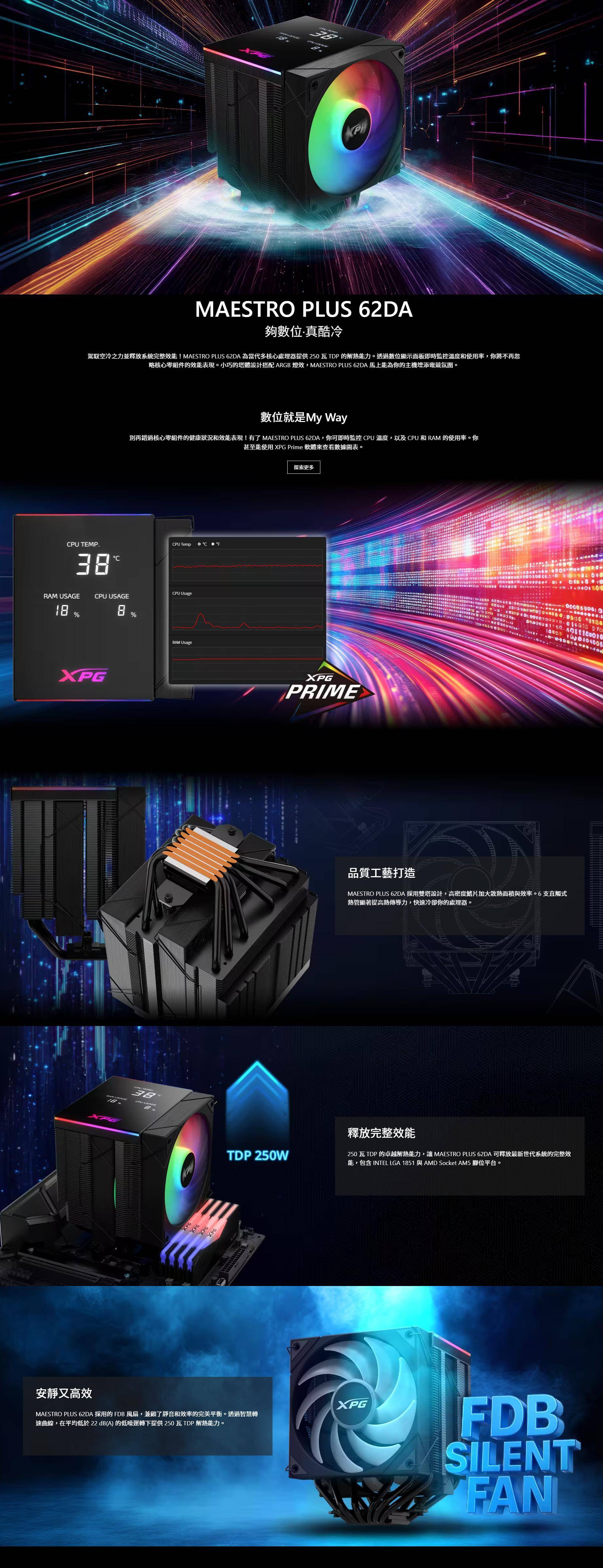 【XPG 威剛】MAESTRO PLUS 62DA (6導管/數位顯示面版/全黑化/12cm風扇*2/雙塔雙扇/高160mm),工作狂購物網