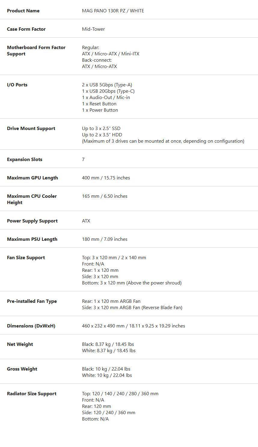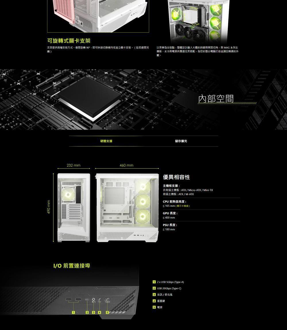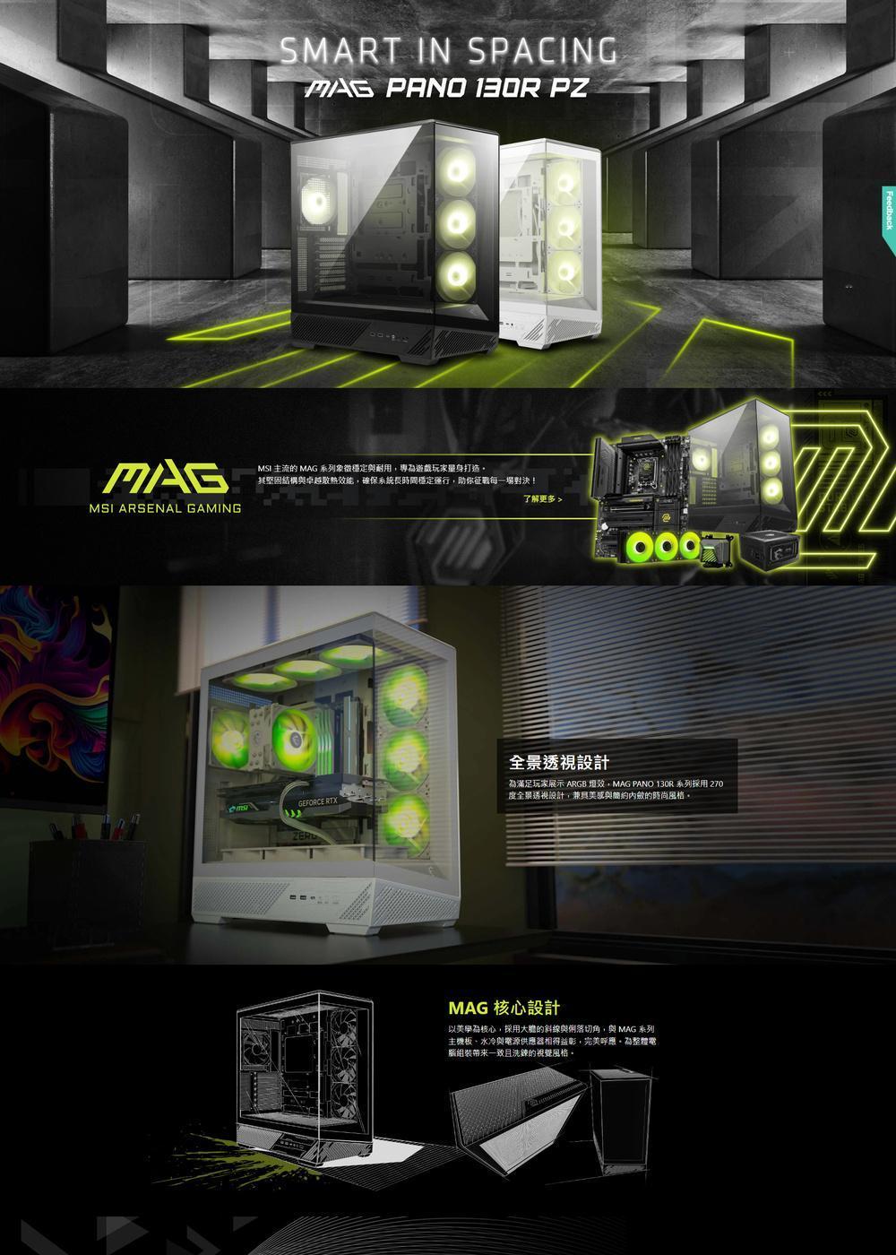 商品詳情 【MSI 微星】MAG PANO 130R PZ 全景玻璃機殼 (ATX/Type-C/內建風扇側3後1/支援背插主板/顯卡400mm/塔散165mm) TWD $1,999 TWD $1,699