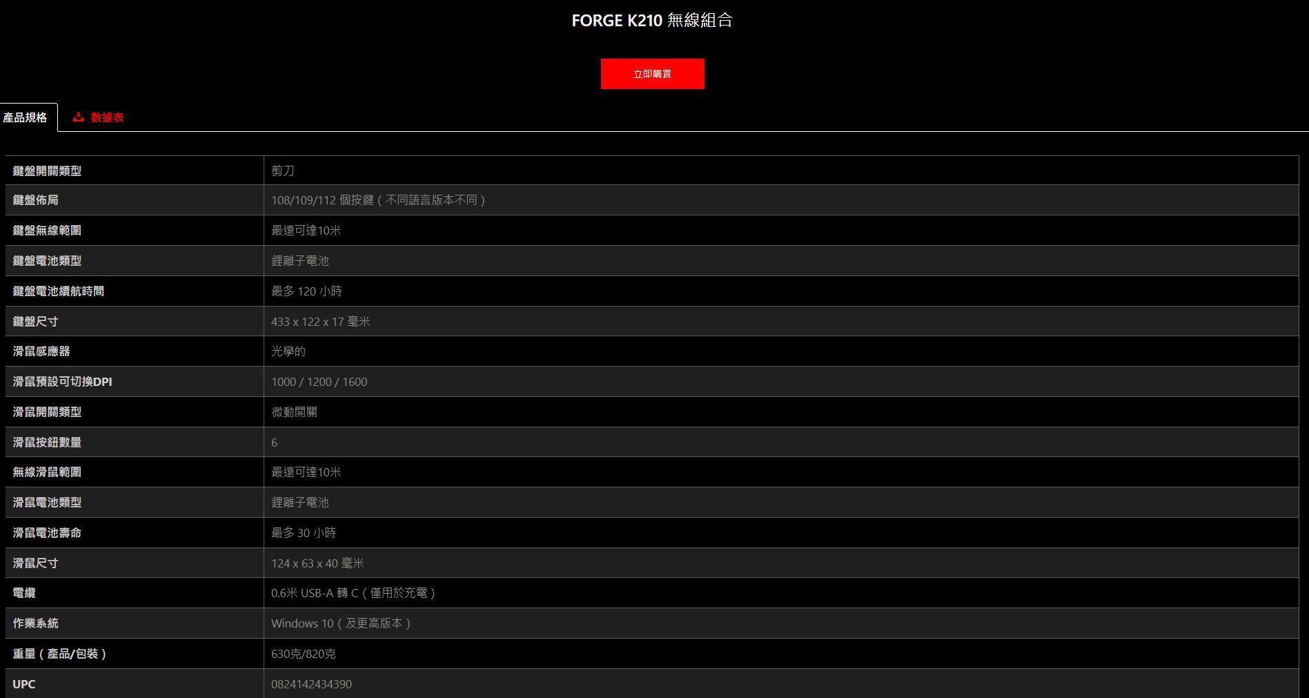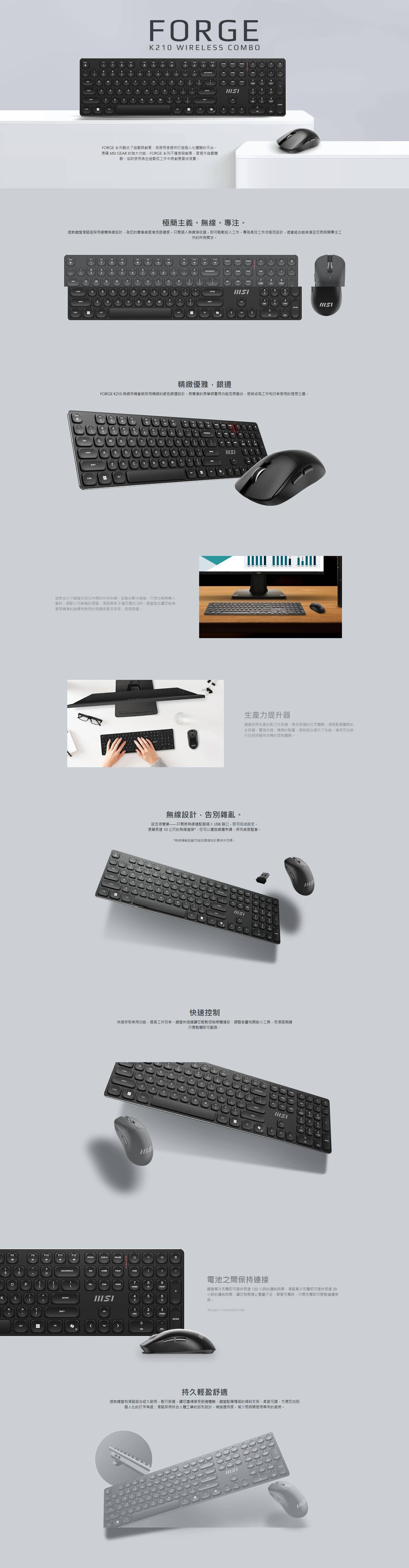 【MSI 微星】FORGE K210 W COMBO TC 微星無線鍵鼠組(黑色/無線/薄膜式/中文/1年保固)